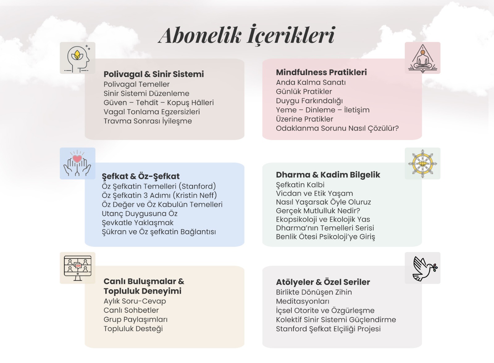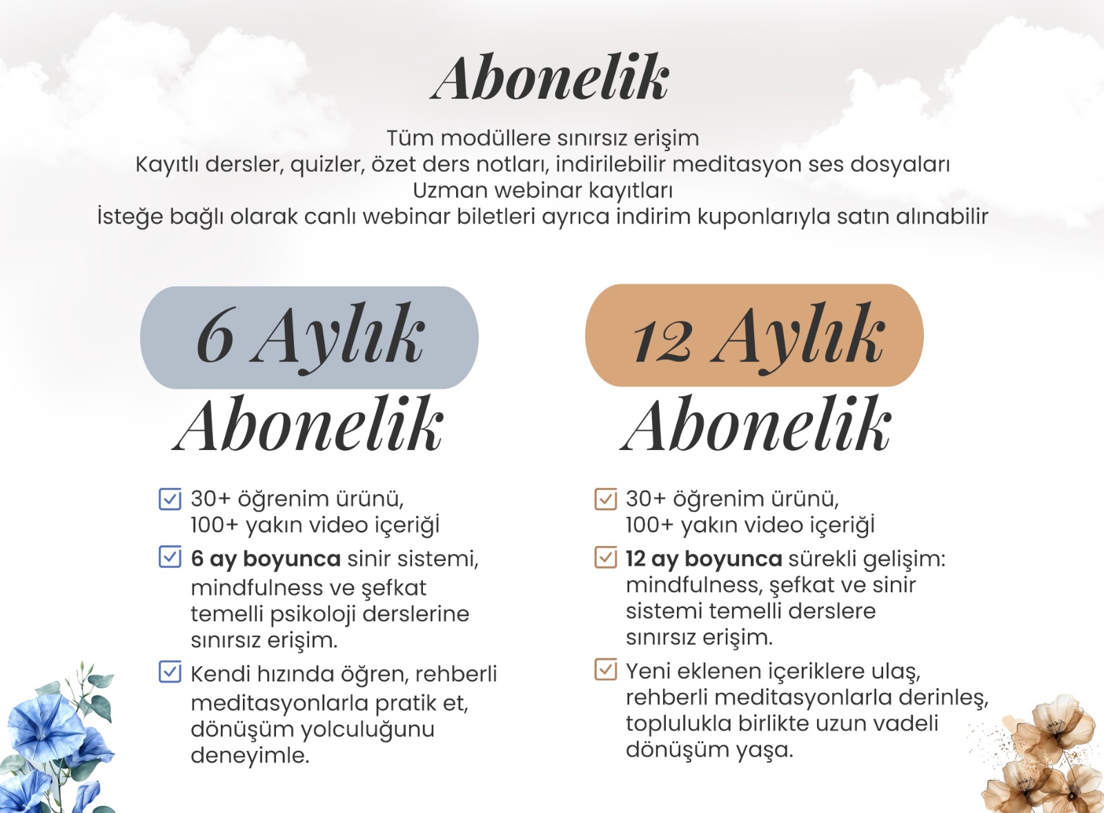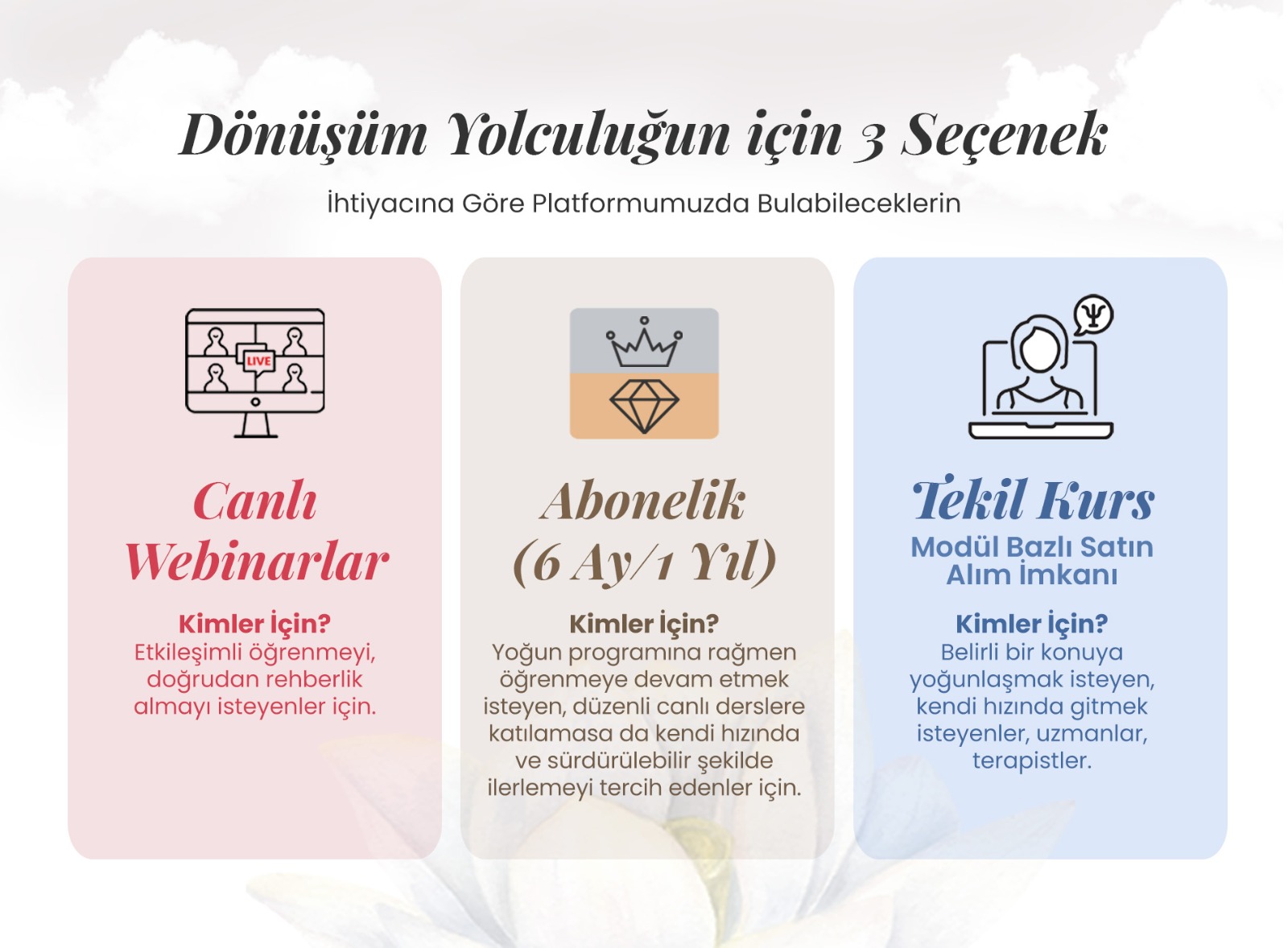 Her dönüşüm yolculuğu özeldir. Bu platformda herkes kendi ritminde, kendi ihtiyacına göre öğrenir ve derinleşir. Sadece izlemek değil, uygulamak ve içselleştirmek için destekleyici araçlarla donatılmış bir öğrenme deneyimi sunar.