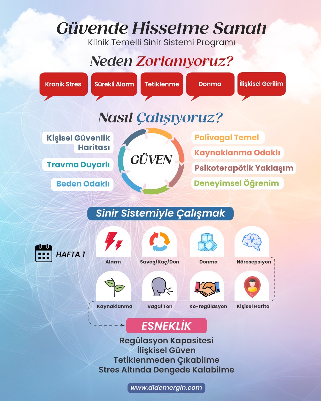 Güvende Hissetme Sanatı, klinik psikoterapi pratiği olan bir terapist tarafından yürütülen, travma-duyarlı ve deneyimsel bir sinir sistemi programıdır. Terapi değildir.